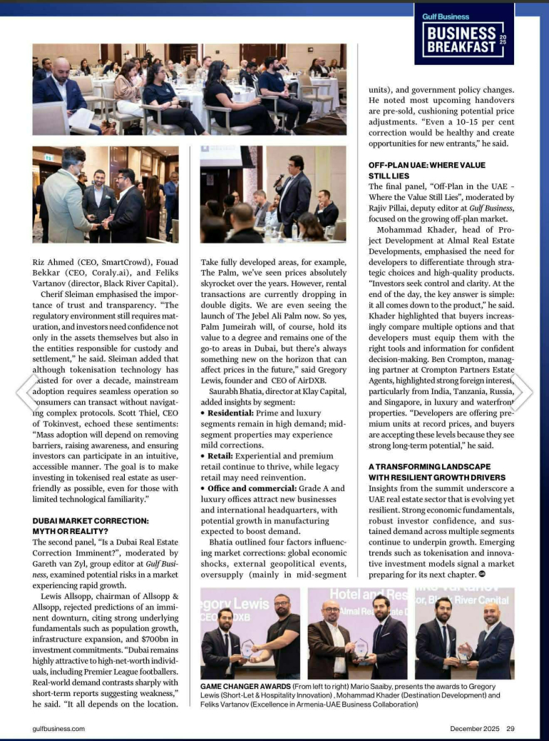 Նոյեմբերի 25-ին Դուբայում տեղի է ունեցել «Gulf Business» անշարժ գույքի գագաթնաժողովը, որը միավորել է ֆինանսների, կարգավորման, զարգացման և բրոքերային ոլորտի առաջատար մասնագետներին՝ քննարկելու ԱՄԷ անշարժ գույքի ոլորտի ապագան։