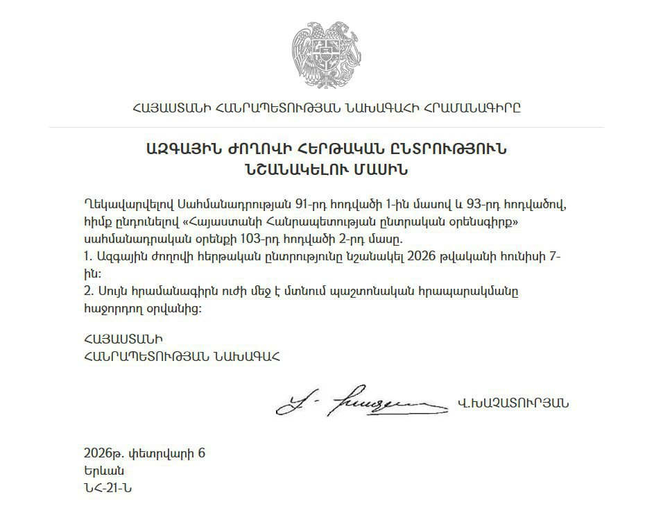 Ազգային ժողովի հերթական ընտրությունը կկայանա 2026 թվականի հունիսի 7-ին: