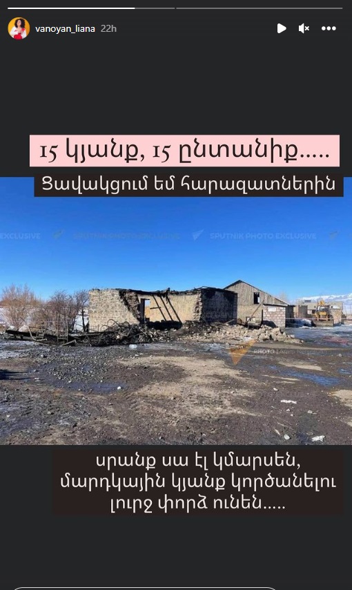 Դերասանուհի, հումորիստ Լիանա Վանոյանն Ինստագրամի իր էջի «Սթորի» բաժնում անդրադարձել է Գեղարքունիքի մարզի Ազատ գյուղի տարածքում տեղակայված զորամասում բռնկված հրդեհի վերաբերյալ՝ հրապարակելով լուսանկարները դեպքի վայրից: